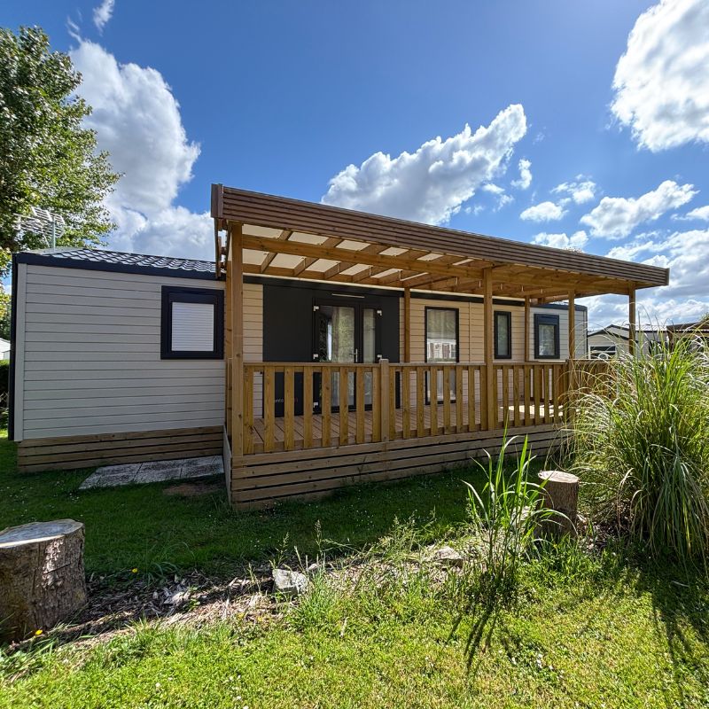 Mobil-home Santa Fe de 2023 en 3 chambres et 2 salles de bains avec clim réversible à vendre sur le camping. Il possède une terrasse couverte de 6m par 2,5m ainsi qu'un abri de jardin Dacri 2023